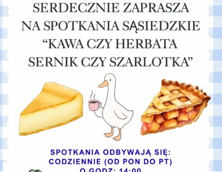 Zapraszamy od pon. do pt. o godz. 14:00 na spotkania sąsiedzkie “Kawa czy herbata, sernik czy szarlotka”.