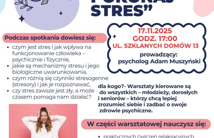 Zapraszamy w dniu 17.11.2025 r. o godz. 17:00 na szkolenie i warsztaty “Poznaj i pokonaj stres”