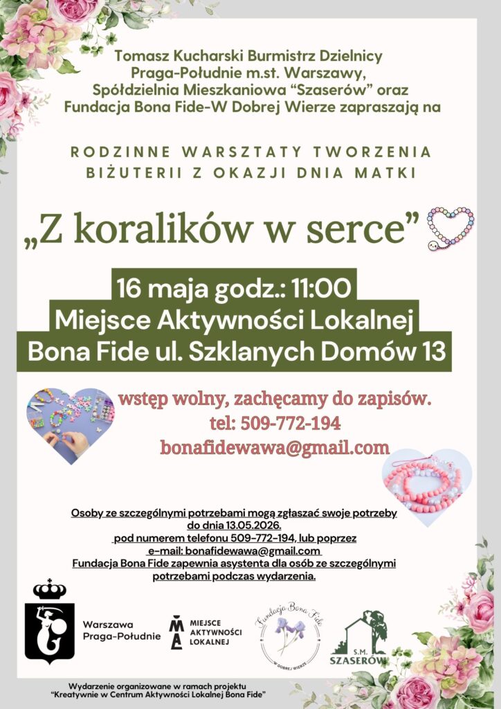 Zapraszamy w dniu 16.05.2026 r. godz. 11:00 na Rodzinne warsztaty tworzenia biżuterii z okazji Dnia Matki.