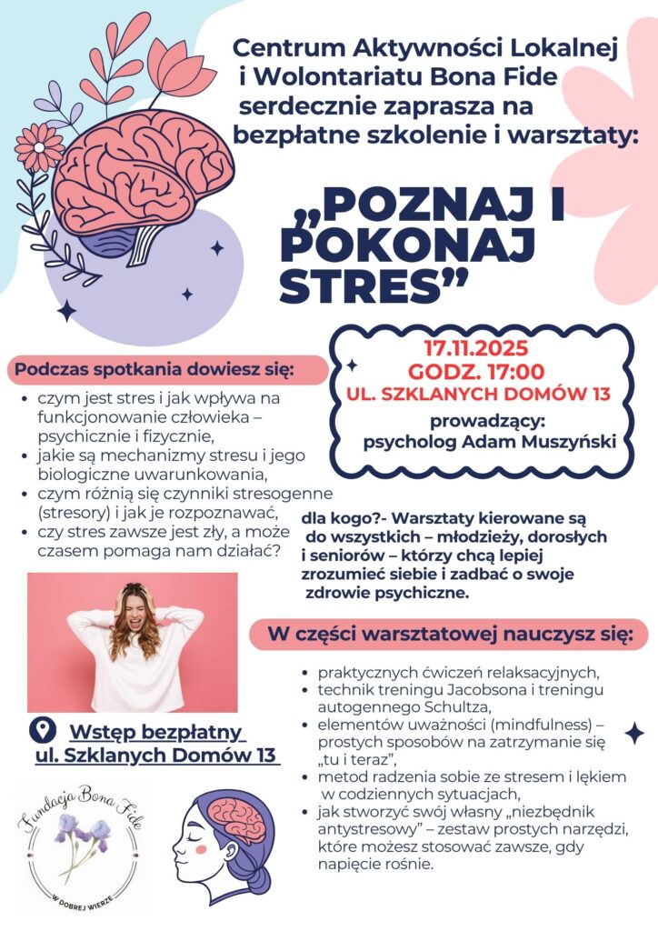 Zapraszamy w dniu 17.11.2025 r. o godz. 17:00 na szkolenie i warsztaty “Poznaj i pokonaj stres”