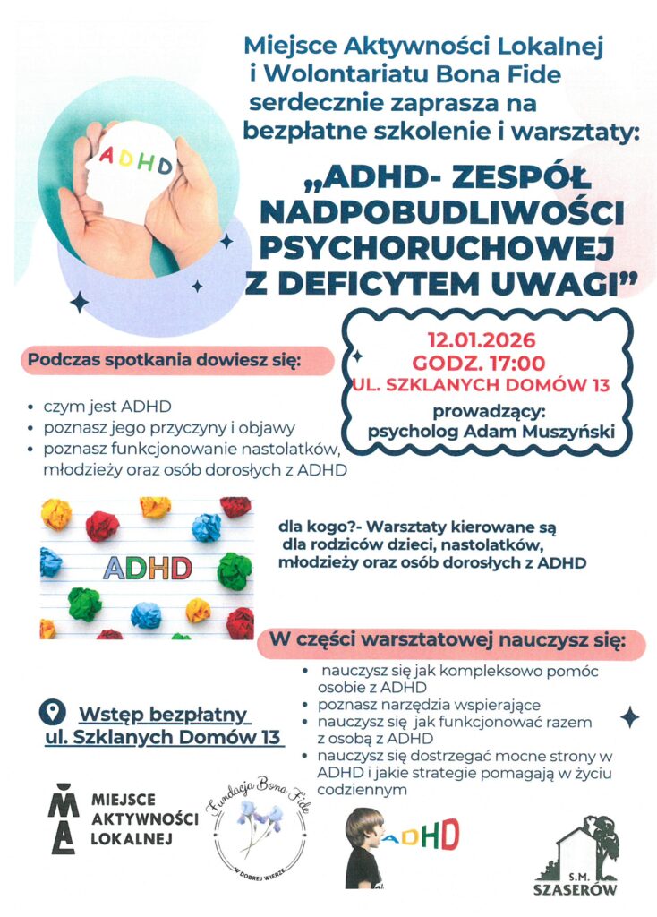 Zapraszamy w dniu 12.01.2026 r. na spotkanie warsztatowe dla rodziców, dzieci i młodzieży z ADHD