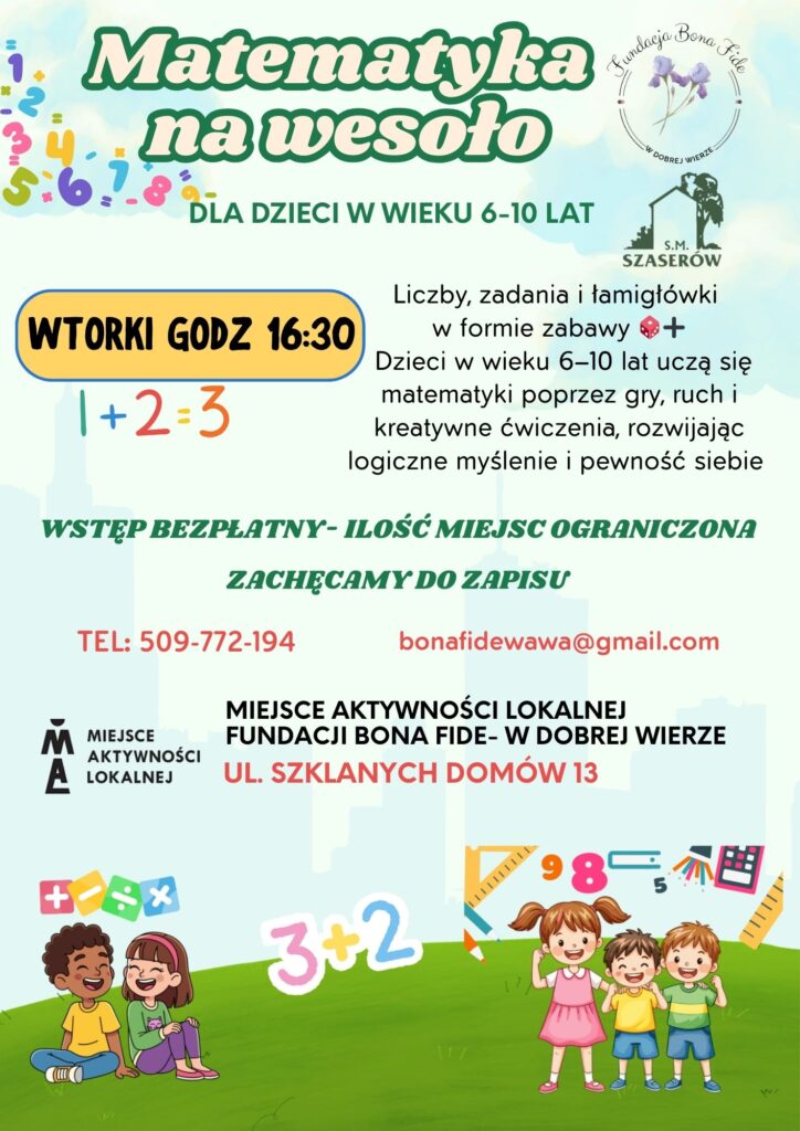 Szanowni Państwo, prosimy o zwrócenie uwagi na zmianę godzin zajęć “Matematyka na wesoło” dla dzieci w wieku 6-10 lat, wtorki godz. 16:30. Wstęp bezpłatny.