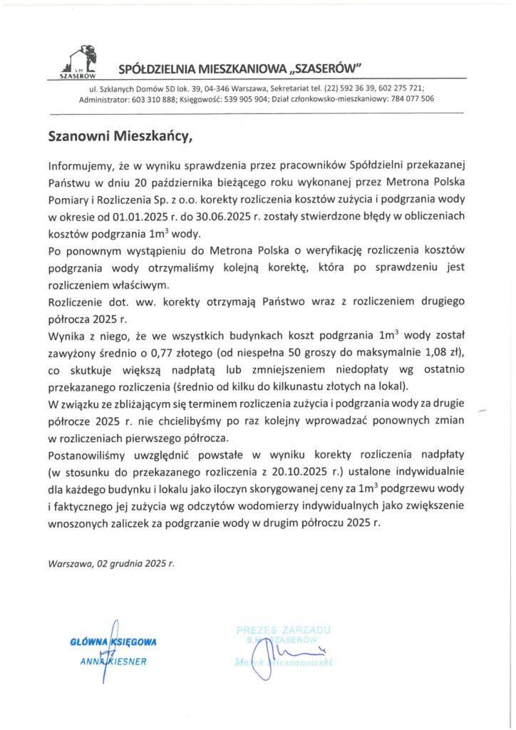 Informacja dotycząca korekty rozliczenia kosztów zużycia i podgrzania wody wykonanej przez Metrona Polska Pomiary i Rozliczenia Sp. z o.o.