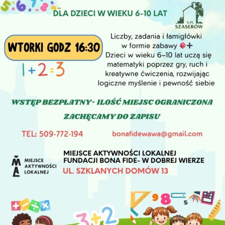 Szanowni Państwo, prosimy o zwrócenie uwagi na zmianę godzin zajęć “Matematyka na wesoło” dla dzieci w wieku 6-10 lat, wtorki godz. 16:30. Wstęp bezpłatny.