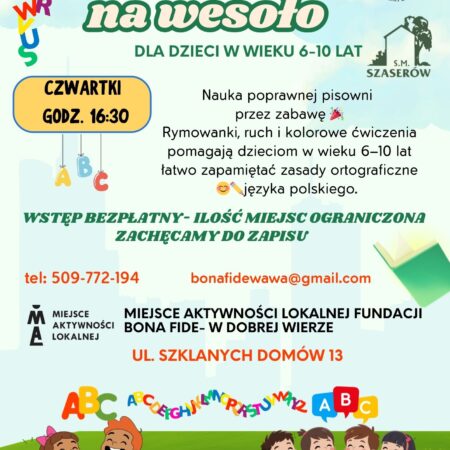 Szanowni Państwo, prosimy o zwrócenie uwagi na zmianę godzin zajęć “Ortografia na wesoło” dla dzieci w wieku 6-10 lat, czwartki godz. 16:30. Wstęp bezpłatny.