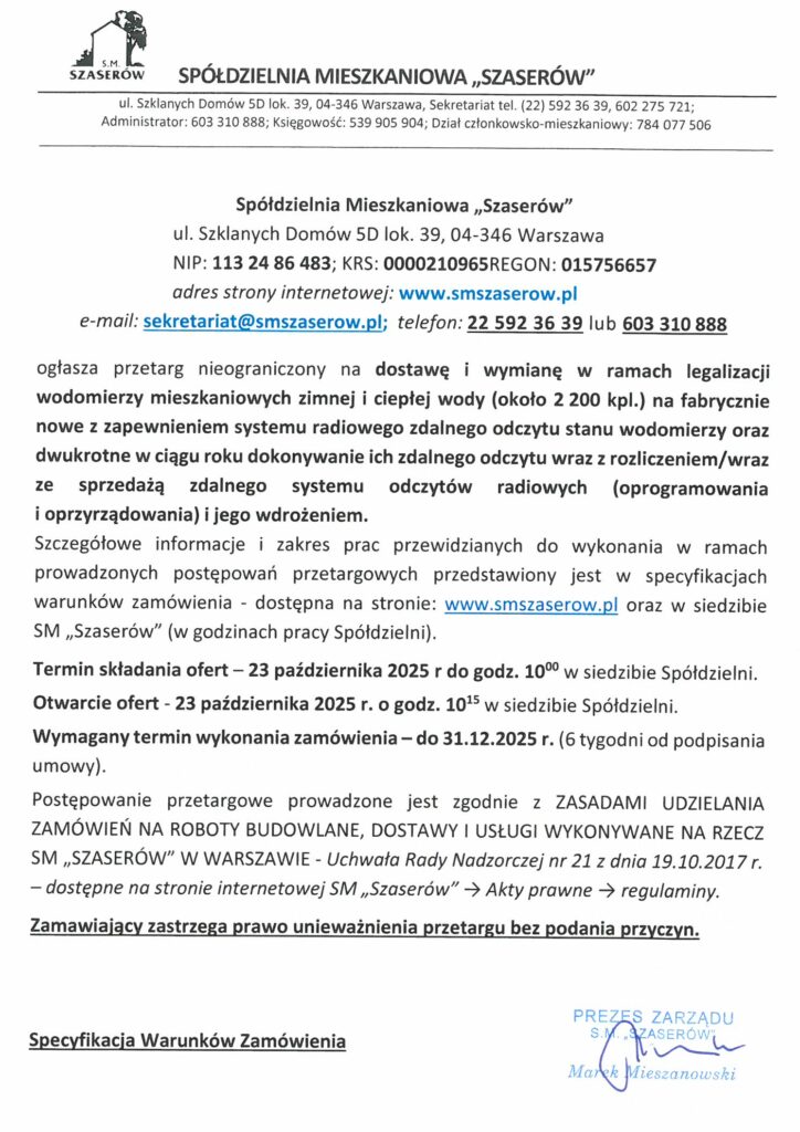 Ogłoszenie dotyczące przetargu nieograniczonego na wymianę wodomierzy