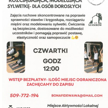Gimnastyka usprawniająca stawy i kręgosłup, rozciągająca, modelująca sylwetkę – dla osób dorosłych, czwartki godz. 12:00. Wstęp bezpłatny.