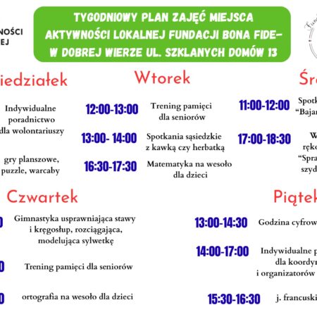 Zapraszamy do zapoznania się z tygodniowym Planem zajęć Miejsca Aktywności Lokalnej Fundacji BONA-FIDE w Dobrej Wierze.