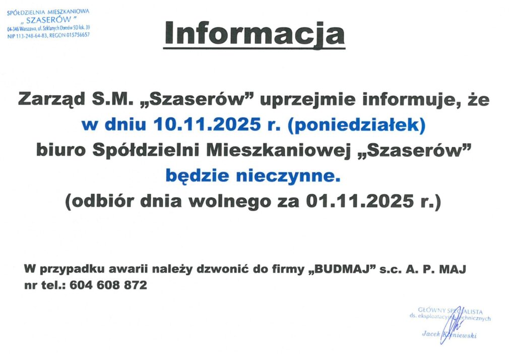 W poniedziałek 10.11.2025r. nasze biuro będzie nieczynne