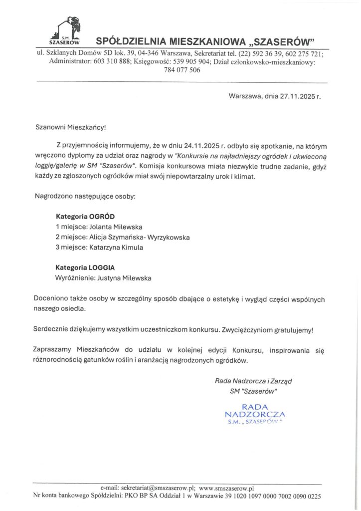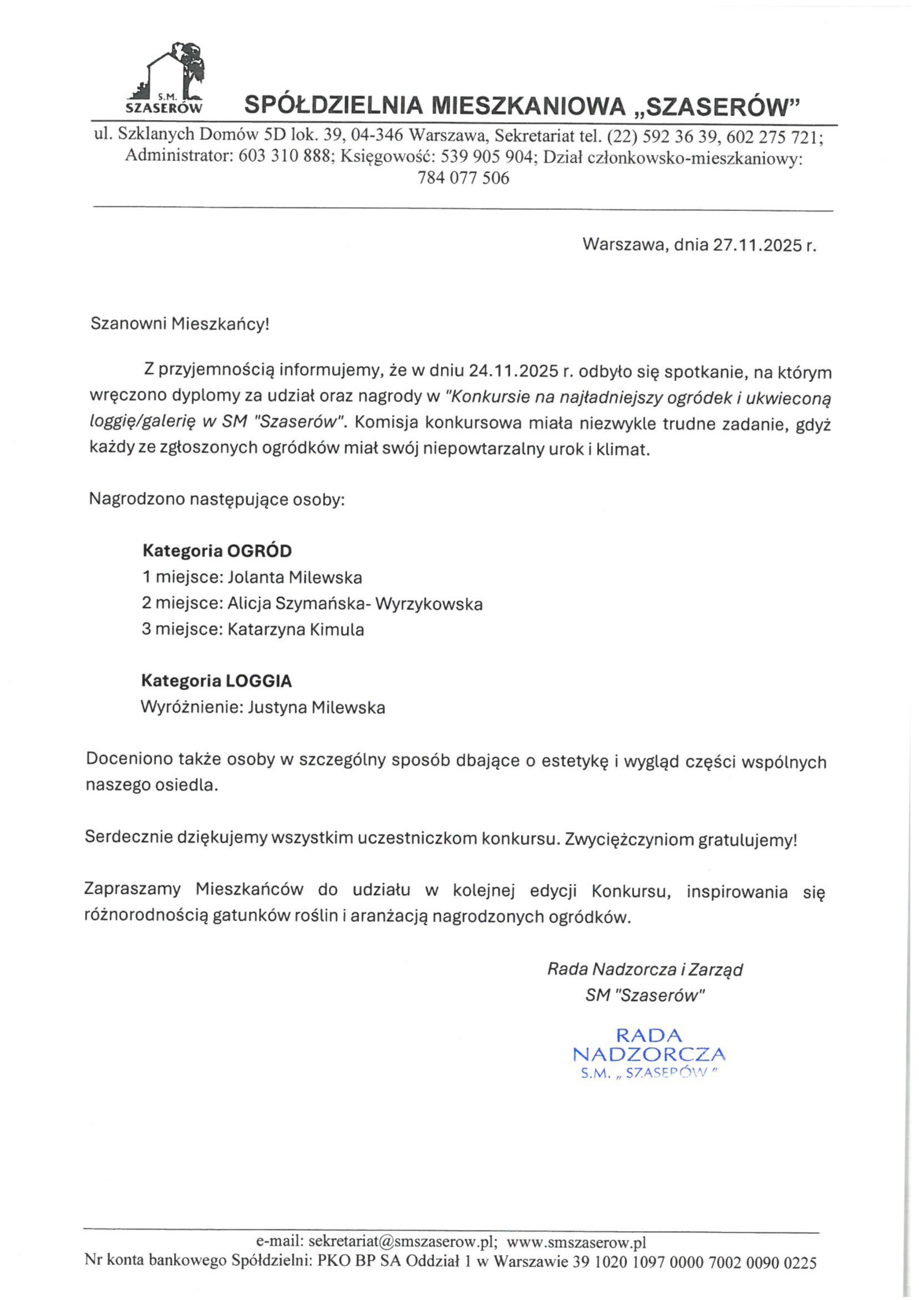 Wręczenie dyplomów i nagród w konkursie na najładniejszy ogródek i ukwieconą loggię/galerię w SM “Szaserów”