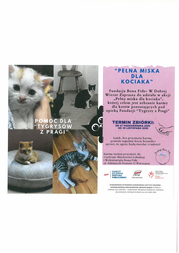 Zapraszamy do udziału w akcji “Pełna miska dla kociaka”. Termin zbiórki od 27.10.2025 r. do 30.11.2025 r.