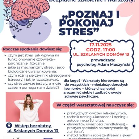 Zapraszamy w dniu 17.11.2025 r. o godz. 17:00 na szkolenie i warsztaty “Poznaj i pokonaj stres”