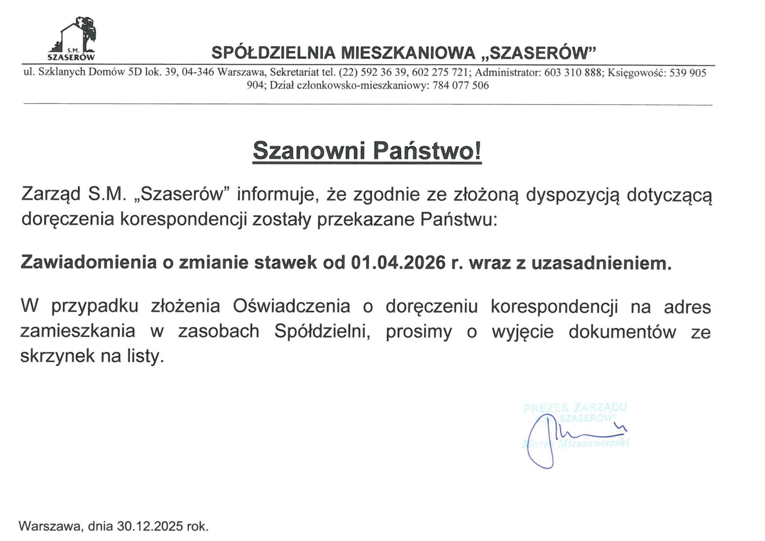 Dyżury Rady Nadzorczej SM “Szaserów” I kwartał 2026 r.
